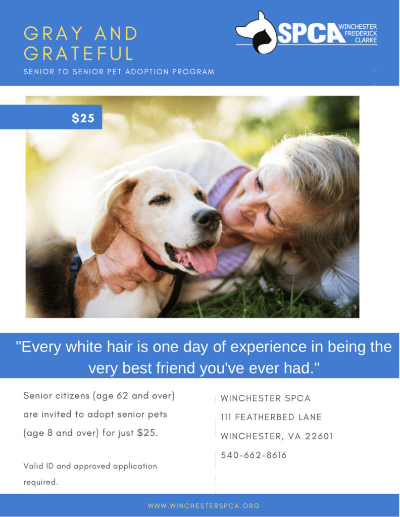 Senior citizens (age 62 and over) are invited to adopt senior pets (age 7 and over) for just $25.